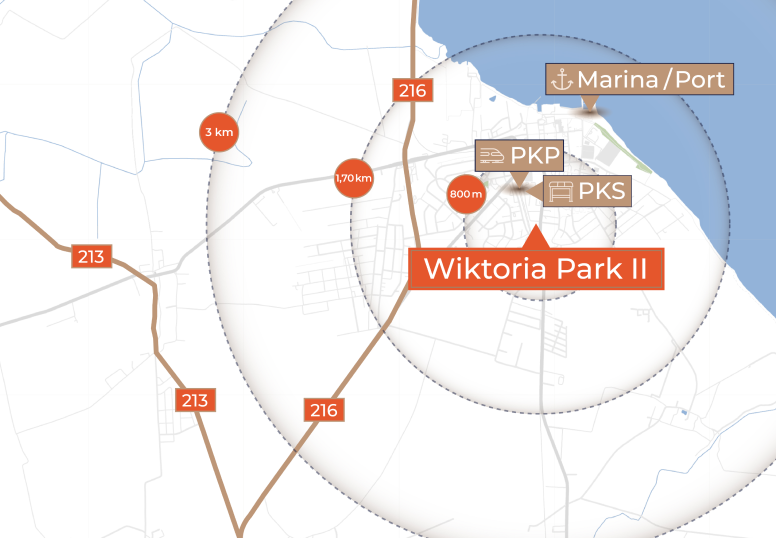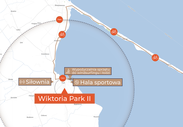 Wiktoria Park II to inwestycja w miejscu, które pozwala oszczędzać czas i cieszyć się codzienną wygodą. Dzięki bliskości stacji kolejowej (zaledwie 300 metrów) w 35 minut dotrzesz do Gdyni, co czyni lokalizację idealną zarówno dla osób dojeżdżających do pracy, jak i tych, którzy szukają szybkiego dostępu do miejskich atrakcji. Krótki spacer będzie dzielić Cię także od centrum Pucka, gdzie załatwisz codzienne sprawy, zrobisz zakupy, a potem odpoczniesz w otoczeniu zieleni i wody.